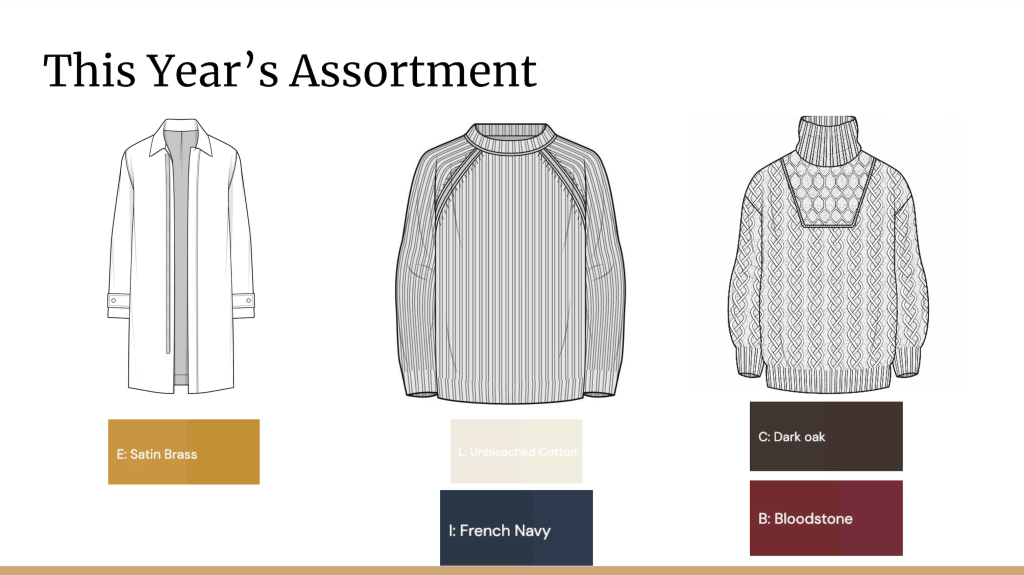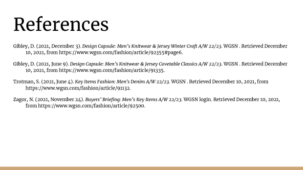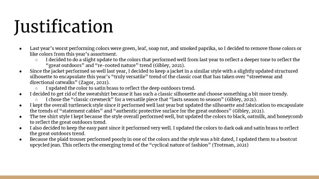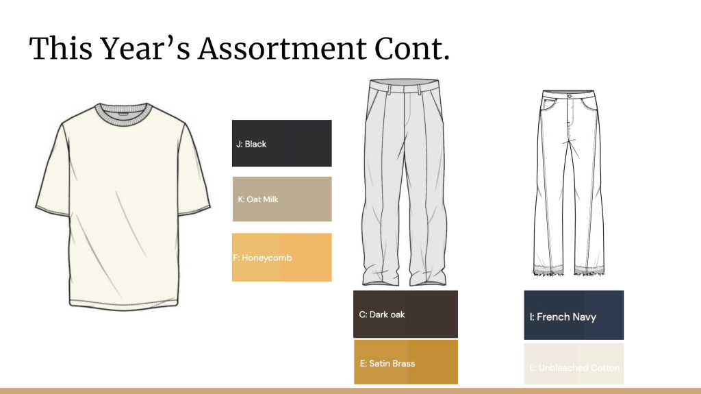 In this case study, I assumed the role of a buyer for a menswear line. I reviewed last year’s sales to decide whether to keep the old product or find newer, trendier items to test in the market. I then created a new assortment after utilizing WGSN for trend, color, and product research.