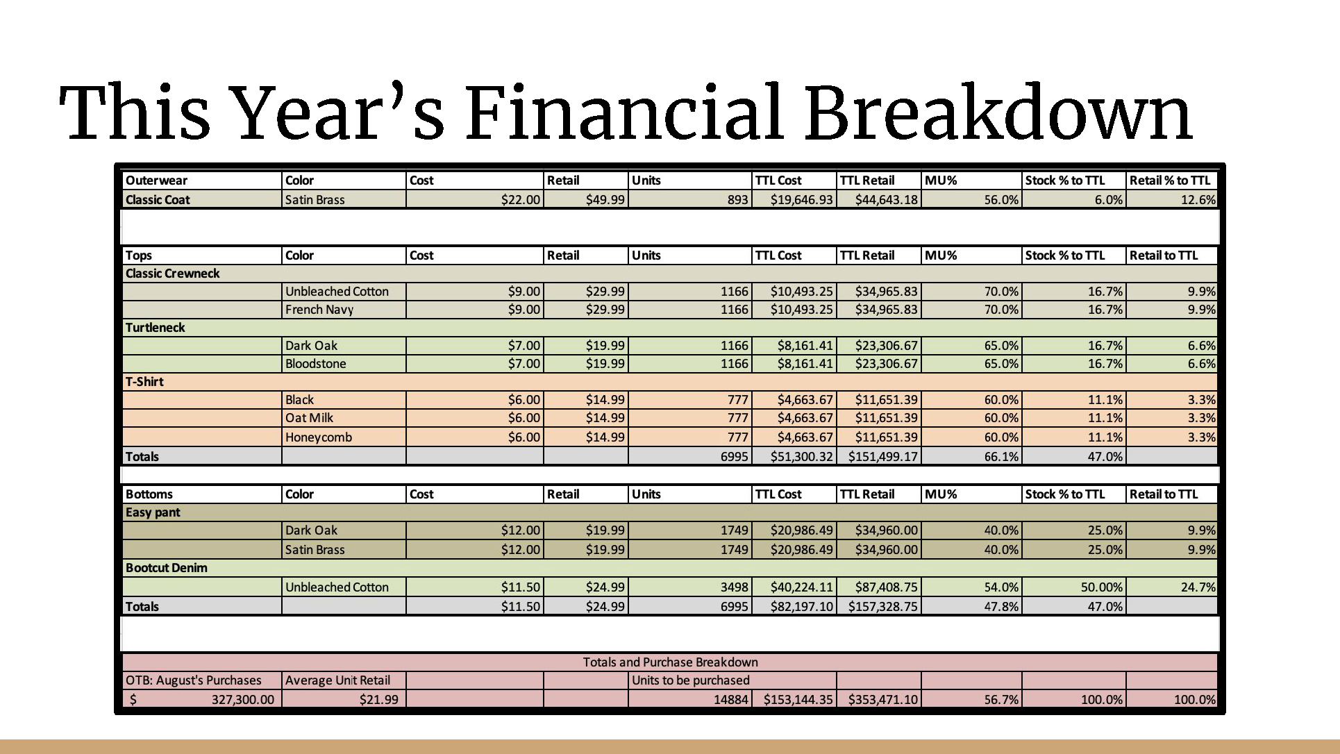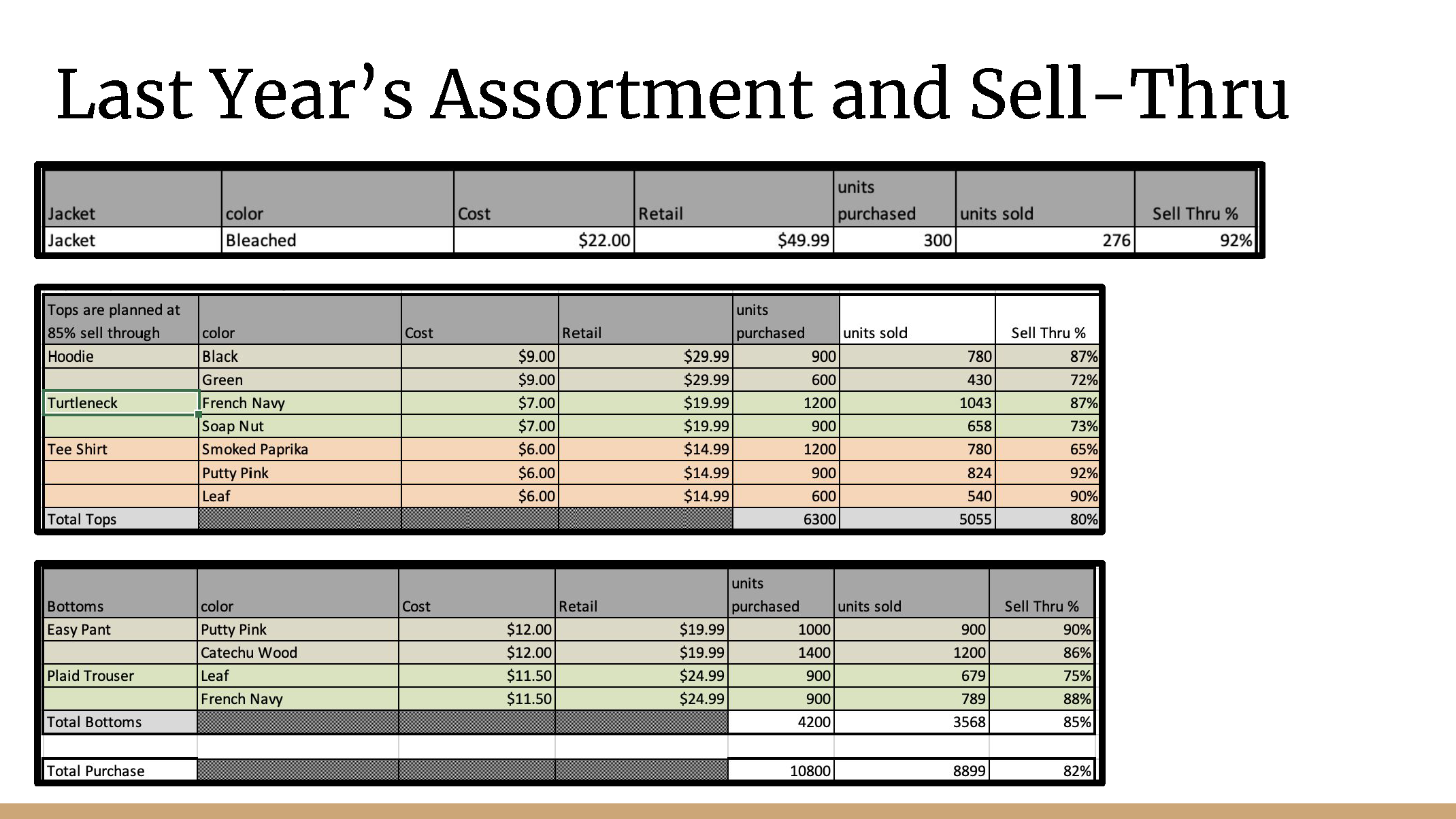 In this case study, I assumed the role of a buyer for a menswear line. I reviewed last year’s sales to decide whether to keep the old product or find newer, trendier items to test in the market. I then created a new assortment after utilizing WGSN for trend, color, and product research.