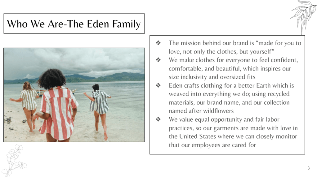 Eden is a brand that I created with four other classmates for our Product Development class in Italy. We spent the entire semester on this project and developing the line, which took an immense amount of collaboration and teamwork.